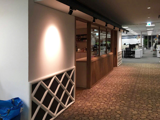グローバルに事業展開する外資系企業様の日本のオフィス内になまこ壁が使用されました。 なまこ壁で室内が一気に和の空間に。 遊び心あるクリエィティブなデザインです。